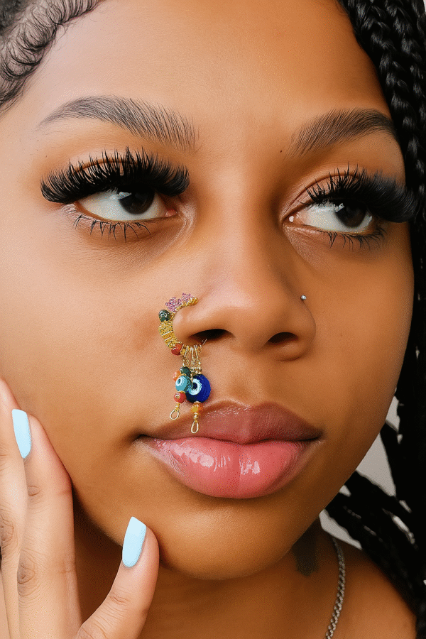 Express yourself with the mesmerizing designs of our Evil Eye nose ring or nose cuff. Choose your gauge size and make a statement today!