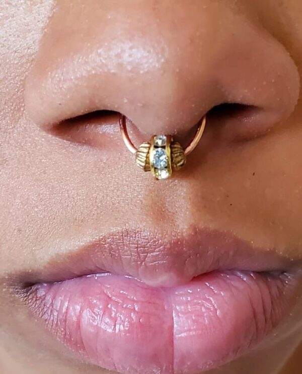 This gorgeous septum nose cuff is beautiful and one of a kind! This cuff brightens up your face once you put it on. Slide the cuff onto the bottom of your nose and gently push together to comfortably stay on your nose