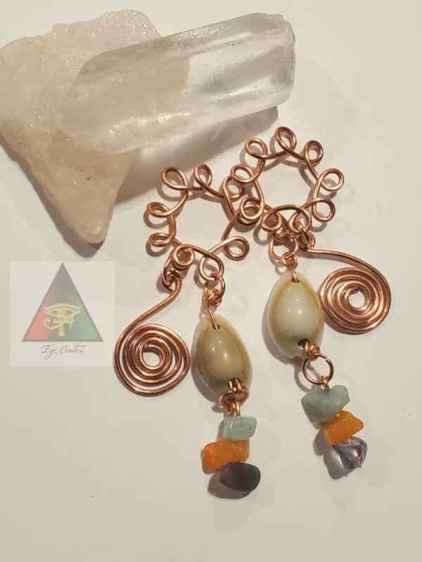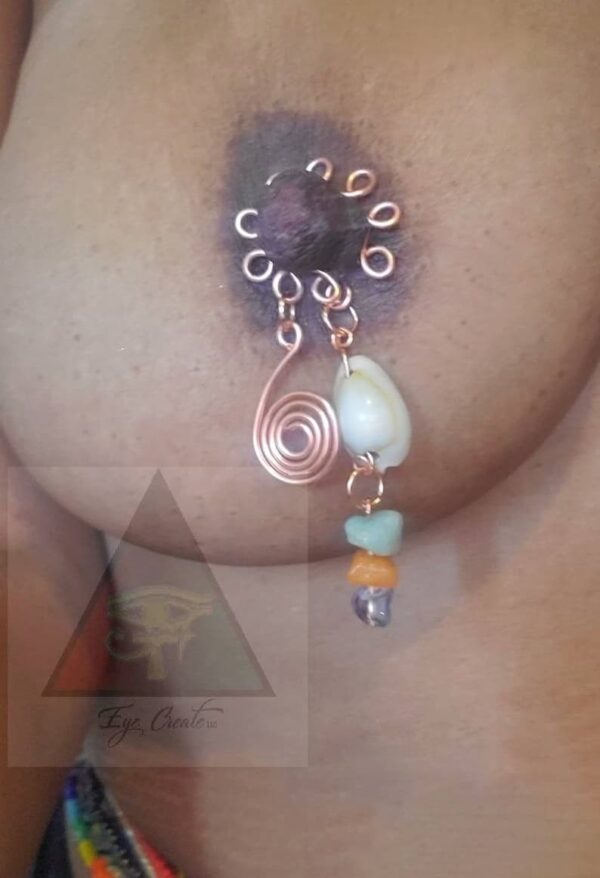 This is another original design created by Eye Create LLC ™️. These nipple cuffs are adjustable and no piercing needed. I am Sekhmet nipple cuffs are decorated with Fluorite Crystals, Cowrie Shells, Amazonite Crystals, Copper Swirls, and Orange Quartzite.☀️🌻💗