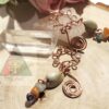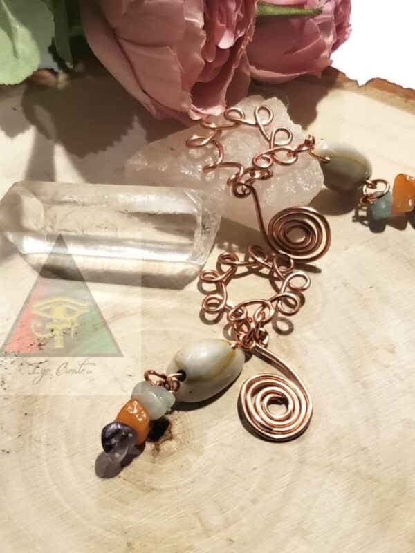Materials: fluorite crystal, orange quartzite, Amazonite, cowrie shells, copper, plated copper wire