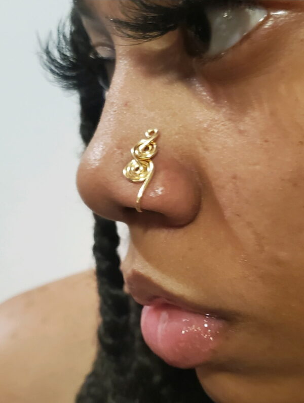 Through the eyes of an artist, this nose cuff can be seen as a shape of a woman. Mother Earth is all things of nature, the earth, moon, stars, and the creator of all life.