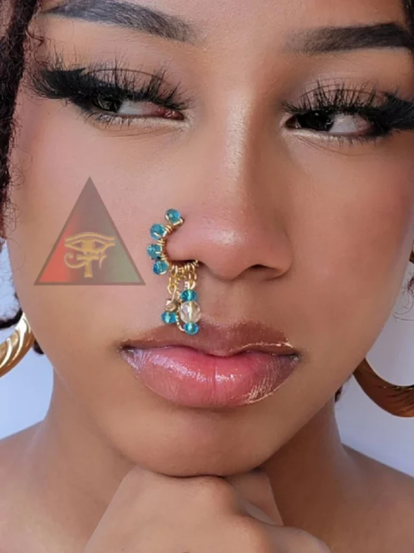 This beautiful piece is another bad creation designed by EYE CREATE LLC ™️. It is adorned with breath taking AB Swarovski Crystal beads and DETACHABLE DOUBLE NOSE CHAIN with hook. THIS PIECE CAN BE ORDERED FOR PIERCED AND NON PIERCED NOSES! PLEASE SELECT NOSE CUFF FOR NON PIERCED NOSES. CHOOSE YOUR COLOR STONES, WIRE AND GAUGE. THIS PIECE IS HANDMADE AND MADE TO ORDER 💕💜