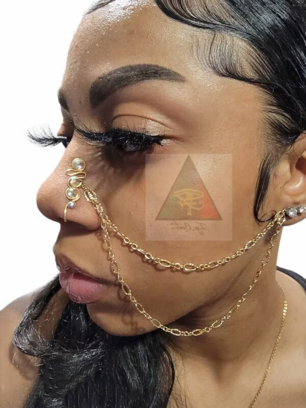 Our Swarovski Crystal Nose Cuff with Chain comes in Gold, silver, or copper. The nose cuff is decorated with Swarovski Crystals. Our nose cuffs are no piercing required. Our nose chain comes with the option of the Chain with or without an earring hook.