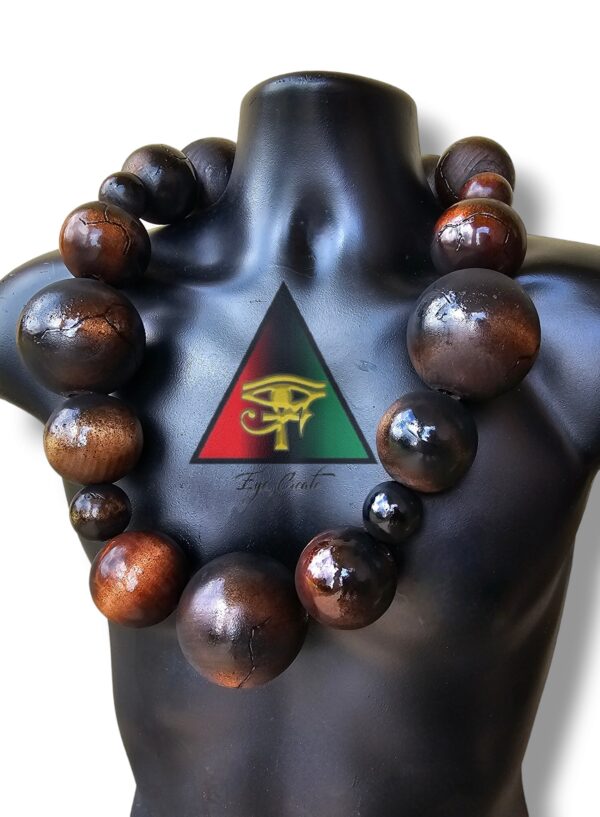 The Ancient One is a bold Afrocentric necklace, handcrafted with engraved wooden beads and lasting quality.