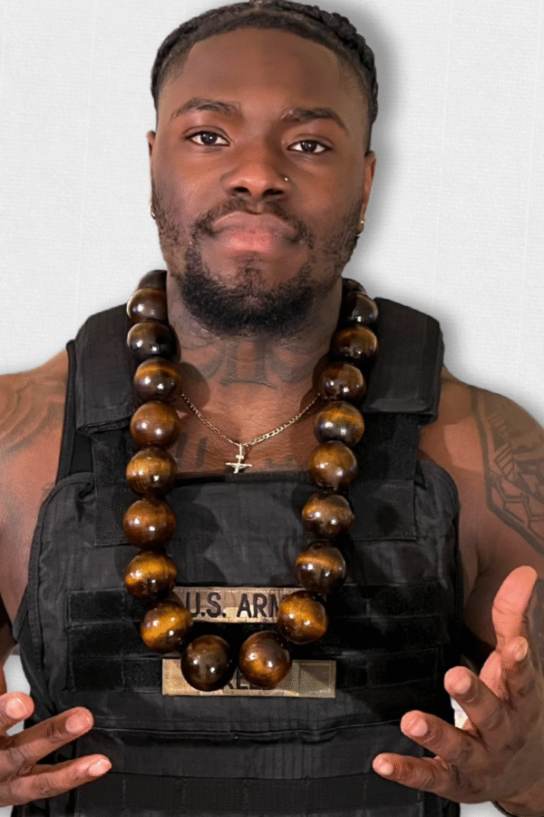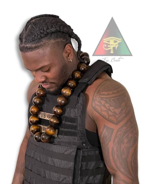 This necklace symbolizes power and strength. The Ogun Warrior Necklace is made with large 40mm walnut stained beads with a gloss finish. These beads are drilled and painted by hand. ✊🏾