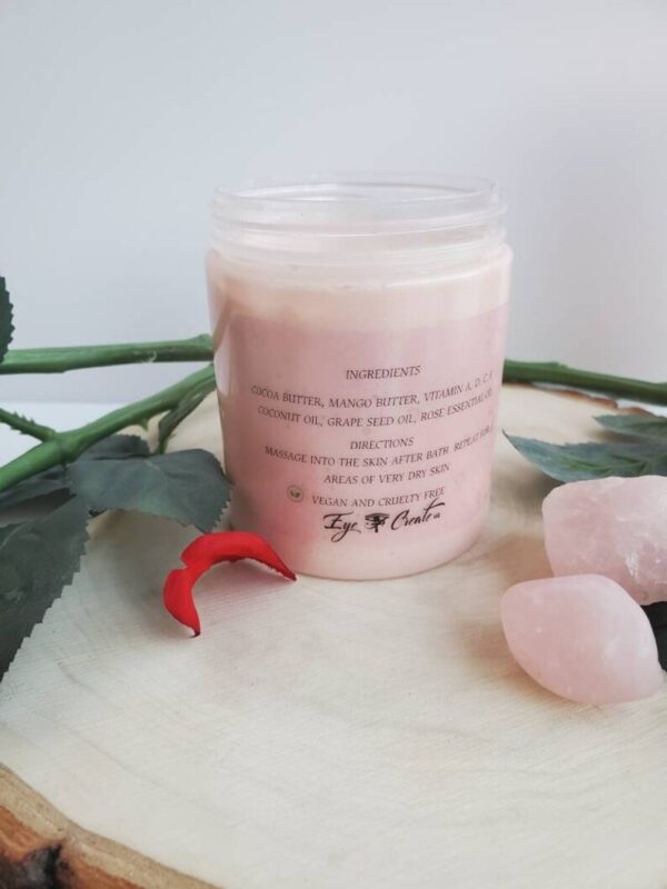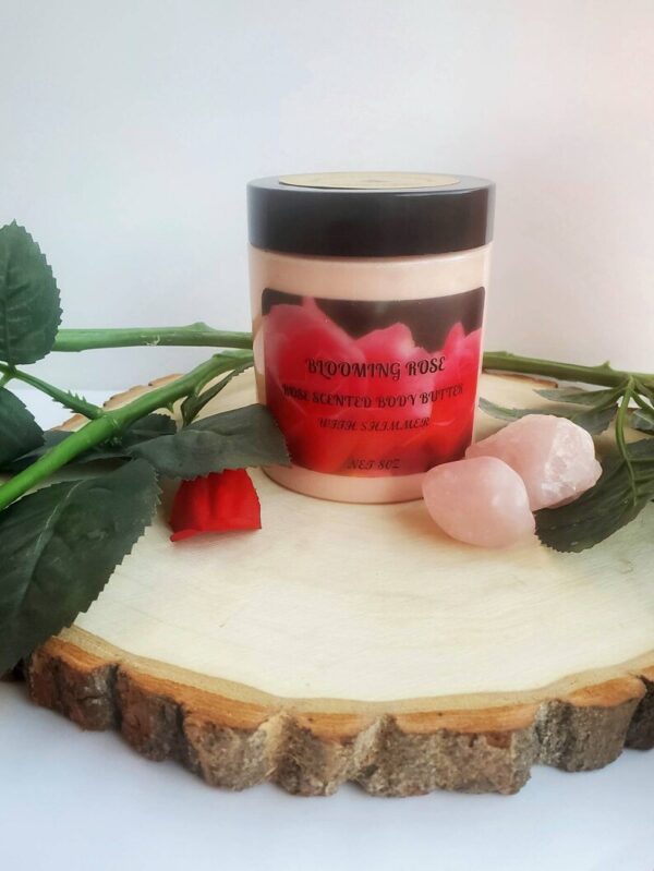 HERE IS OUR NEW BLOOMING ROSE BODY BUTTER WITH SHIMMER! 🥀 This scent is truly amazing! Our Blooming Rose Scented Body Butter is very hydrating and leaves your skin silky and soft. The fragrance of the Rose Petals is long lasting. 🌟 We provide nothing but the best. Homemade, Vegan and Cruelty Free! Directions